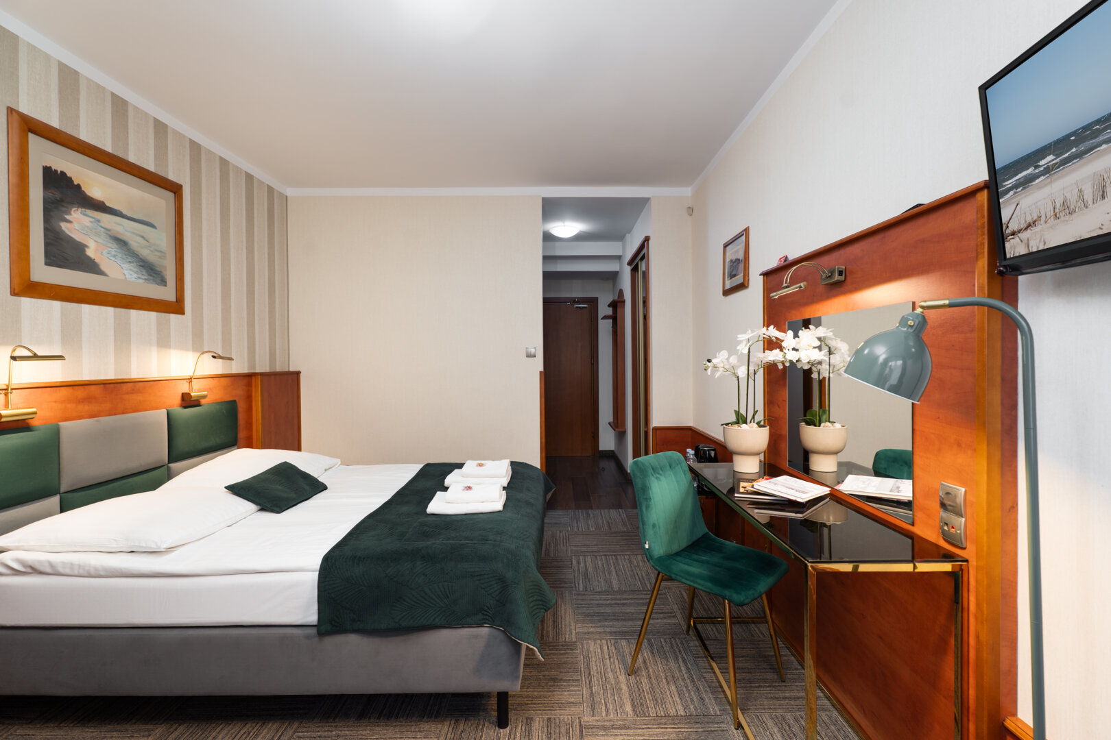 Pokój dwuosobowy wyposażony został w łóżko podwójne (wym. 160 X 200 cm), które można rozdzielić na dwa osobne łóżka (wym. 80 X 200 cm). Pokój nie jest klimatyzowany.