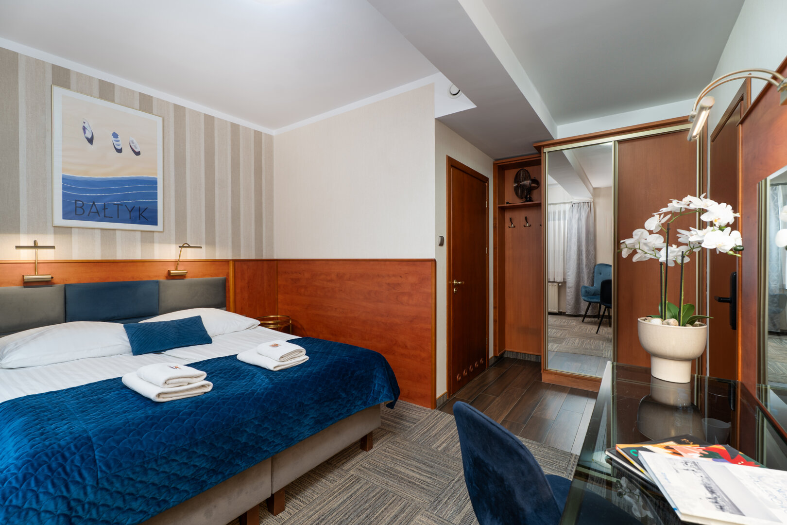 Pokój dwuosobowy wyposażony został w łóżko podwójne (wym. 160 X 200 cm), które można rozdzielić na dwa osobne łóżka (wym. 80 X 200 cm). Pokój nie jest klimatyzowany.