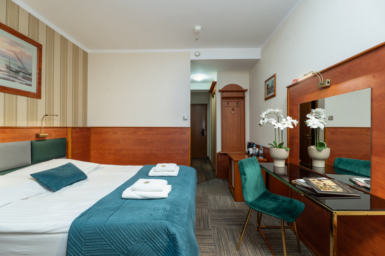 Pokój dwuosobowy wyposażony został w łóżko podwójne (wym. 160 X 200 cm), które można rozdzielić na dwa osobne łóżka (wym. 80 X 200 cm). Pokój nie jest klimatyzowany.