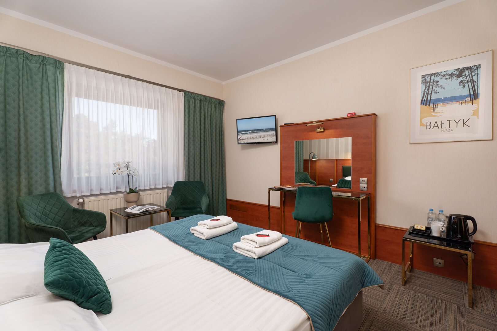Pokój dwuosobowy wyposażony został w łóżko podwójne (wym. 160 X 200 cm), które można rozdzielić na dwa osobne łóżka (wym. 80 X 200 cm). Pokój nie jest klimatyzowany.