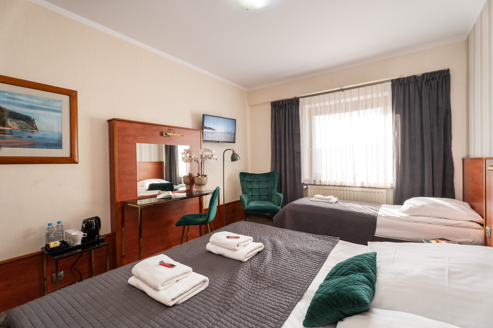 Pokój trzyosobowy wyposażony został w jedno łóżko małżeńskie (o wym. 160 X 200 cm), które można rozdzielić na dwa osobne łóżka (o wym. 80 X 200 cm) oraz jedno dodatkowe łóżko pojedyncze (o wym. 80 X 200 cm).