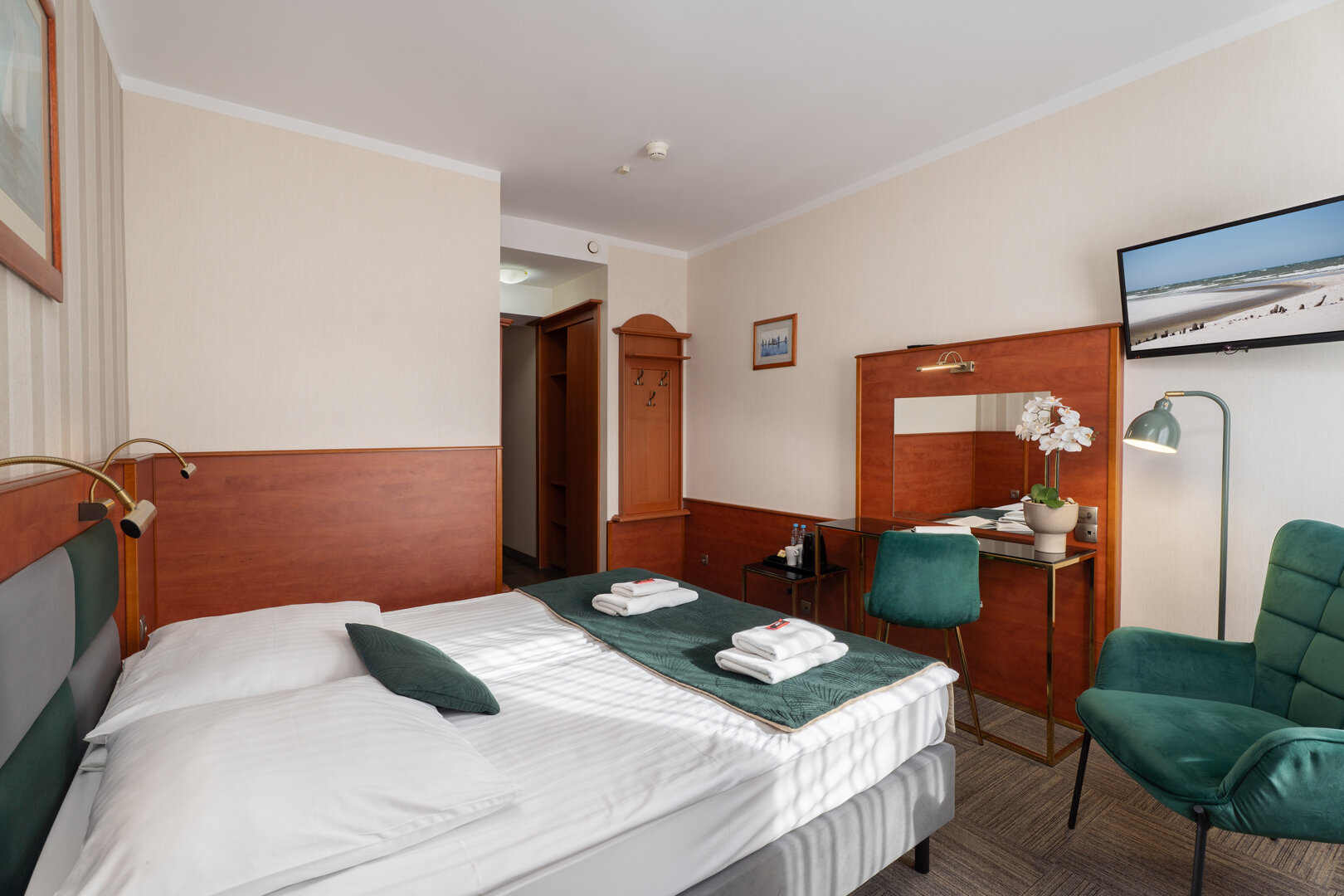 Pokój dwuosobowy wyposażony został w łóżko podwójne (wym. 160 X 200 cm), które można rozdzielić na dwa osobne łóżka (wym. 80 X 200 cm). Pokój nie jest klimatyzowany.