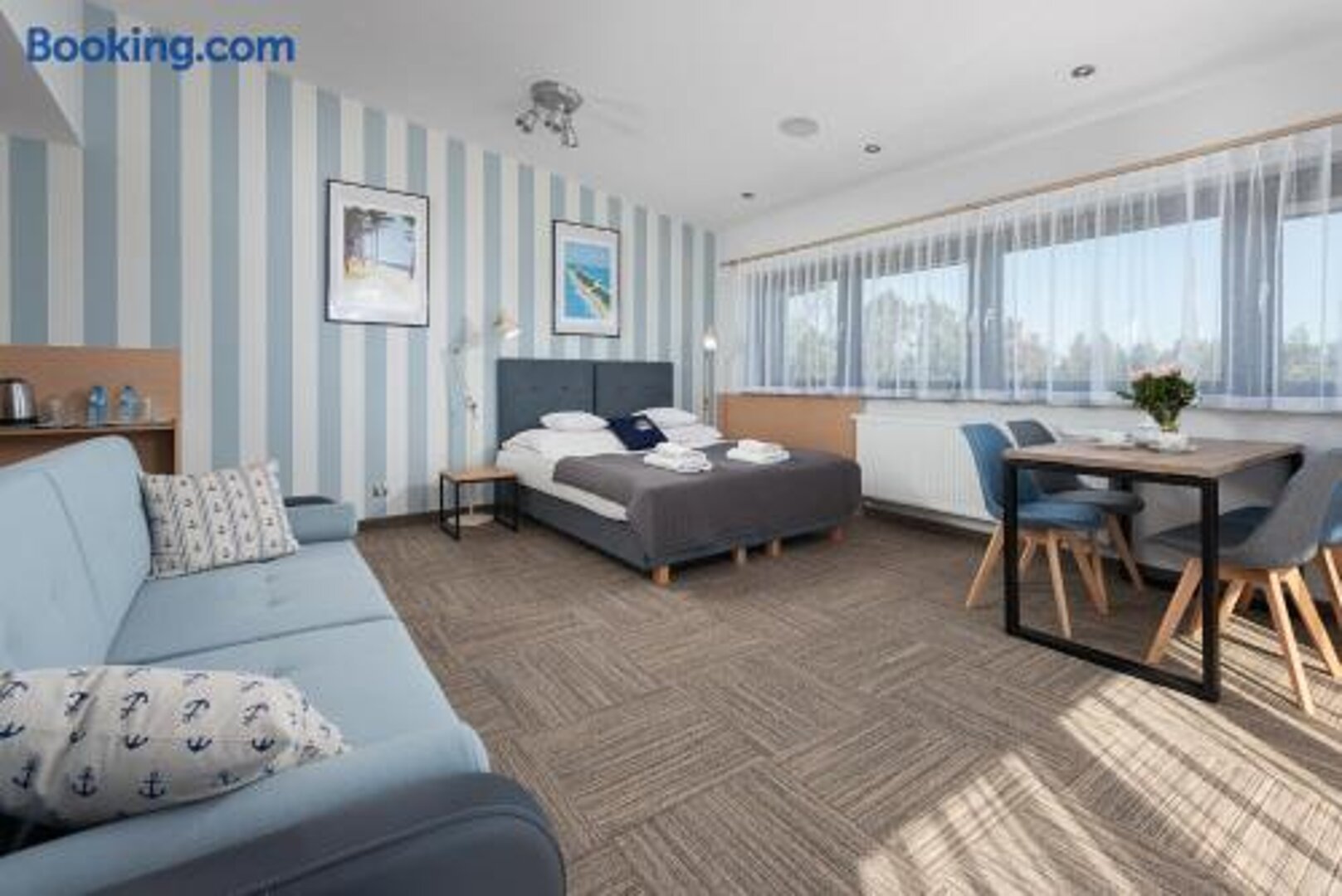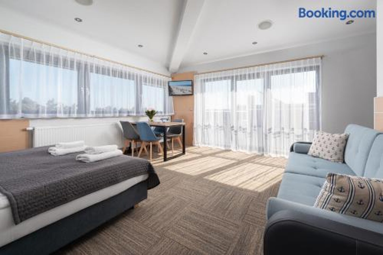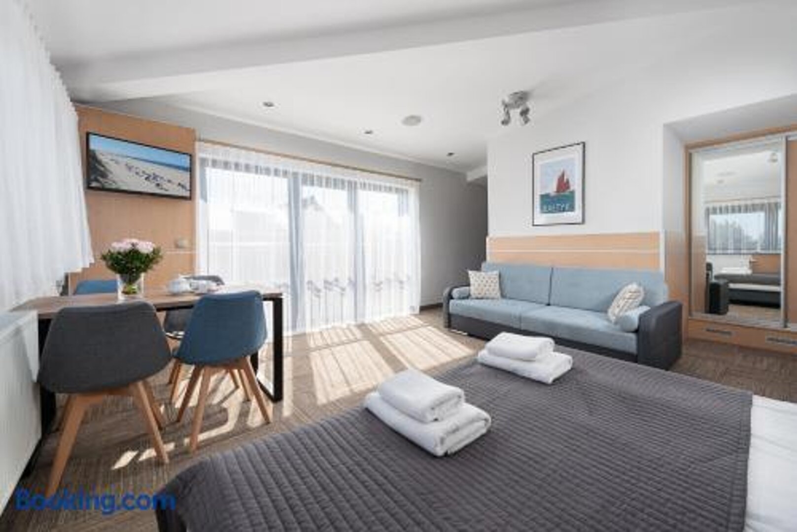 Apartament nie jest klimatyzowany. Składa się z jednego pokoju i łazienki. W apartamencie znajduje się wersalka z funkcją spania (po rozłożeniu 140 X 200 cm) oraz łóżko małżeńskie (160 X 200 cm), które można rozdzielić na dwa osobne łóżka (każde o wymiarach 80 X 200 cm).